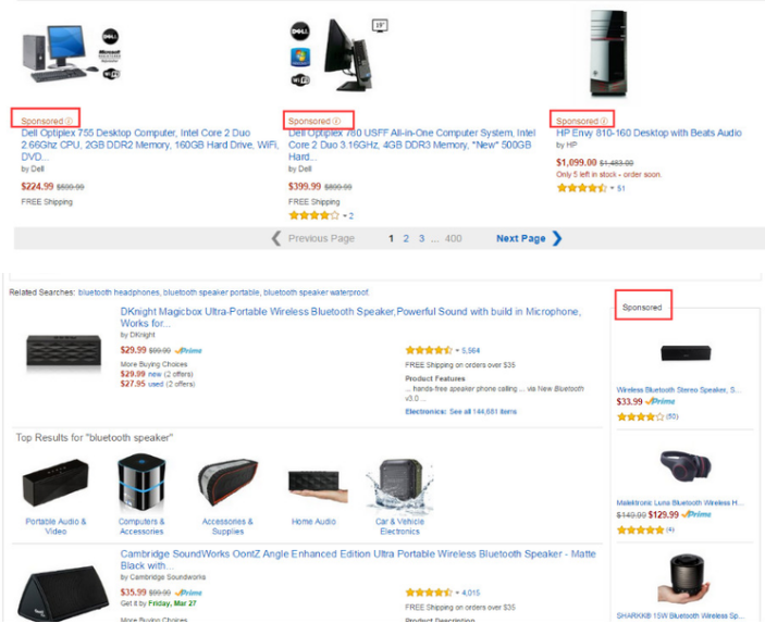 站内广告会出现在搜索栏目下方和左边以及详细产品页面的下方,会有Sponsored标识(如下图)。